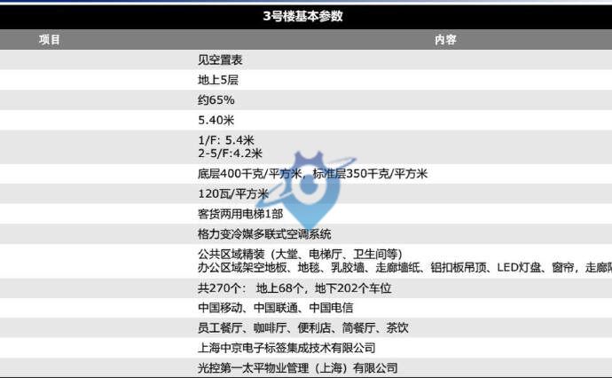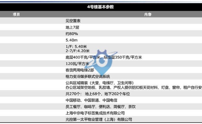 项目位于上海市张江科学城集成电路产业园核心区,名企云集,可做企业研发总部,园区主要包活7幢办公楼,总建筑面积50865平方米,土地性质为工业用地。入驻企业产业类型主要集中在集成电路(如瑞芯微电子、翰迈电子)、在线新经济(町咚买菜)、科技金融(平安、阳光人寿)、新能源(林洋能源)、生物医药(凡迪基因)等。 --------------------------------------------------------------------------------------------------------------- ●项目名称:《张江光大园》 ●项目位置:盛夏路500弄 ●轨道交通:2号线广兰路720米、中环高架高科中路出入口 ●楼层总高:4层、7层、11层 ●物业费用:21.2元/平/月(含税) ●停车费用:660元/月(含税) ●付款方式:押三付一;押二付二: ●起租年限:1年起租 ●物业管理:光控太平 ●空调系统:可变冷媒多联式空调系统 ●楼板承重:350KG/平方 ●电力供給:100瓦/平 ●楼层层高:吊完顶:净高2.7米 项目位于上海市张江科学城集成电路产业园核心区,名企云集,可做企业研发总部,园区主要包活7幢办公楼,总建筑面积50865平方米,土地性质为工业用地。入驻企业产业类型主要集中在集成电路(如瑞芯微电子、翰迈电子)、在线新经济(町咚买菜)、科技金融(平安养老、阳光人寿)、新能源(林洋能源)、生物医药(凡迪基因)等。------------------------------------------------------------------------------------------------------------●项目名称:《张江光大园》●项目位置:盛夏路500弄●轨道交通 1 独栋 可冠名 2 通燃气 便于公司食堂 或者商务宴请接待 3 园区商业配套成熟 4 新园区 位置好 交通便利 5 项目户型方正 全景落地窗 上海策驻商务咨询有限公司 专注房源精耕,房源情况均来自线下及本人实地勘察,经验丰富的物业顾问团队,精细入微的服务理念,为您打造高效率的找房之旅。本公司丰富的房源库可满足各个类型的公司需要,可随时根据贵公司的业务需求,扩大,缩小空间迁移办公地点。细心分析您的需要,专业 准确 高效 为您匹配所需房源。策驻商务,欢迎您的咨询!